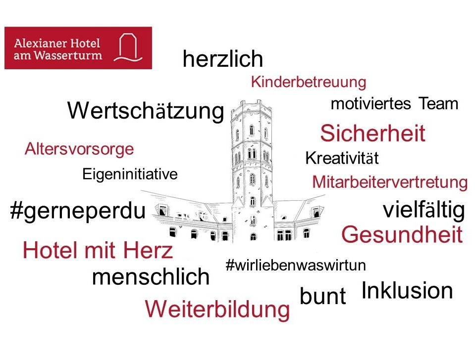 Das Alexianer Hotel am Wasserturm ist ein besonderer Arbeitgeber. Hier machen in einem Inklusionsunternehmen Menschen mit und ohne Behinderung Seite an Seite Karriere in der Hotellerie und Gastronomie. Eine faire, herzliche Behandlung der Mitarbeiter sowie eine rücksichtsvolle Zusammenarbeit im Team stehen im Mittelpunkt des Arbeitsgeschehens. Möchtest du künftig ein Teil dieser tollen Mannschaft sein und deine Karriere mit außergewöhnlichem Aufschwung starten?